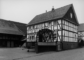 Hofanlage mit 1865 datiertem, giebelständigem Wohnhaus in zwei Geschossen über hohem, massivem Sockel mit konstruktivem Fachwerkverband, dessen Struktur aus 3/4-Streben mit Brustriegeln typisch für die Erbauungszeit ist. Der Eingang ist über eine zweiläufige Freitreppe erreichbar. Wirtschaftsgebäude aus der Erbauungszeit vervollständigen diese Hofanlage zu einem erhaltenswerten Ensemble, das einen akzentsetzenden Blickpunkt zu Beginn der Bergstraße setzt.
