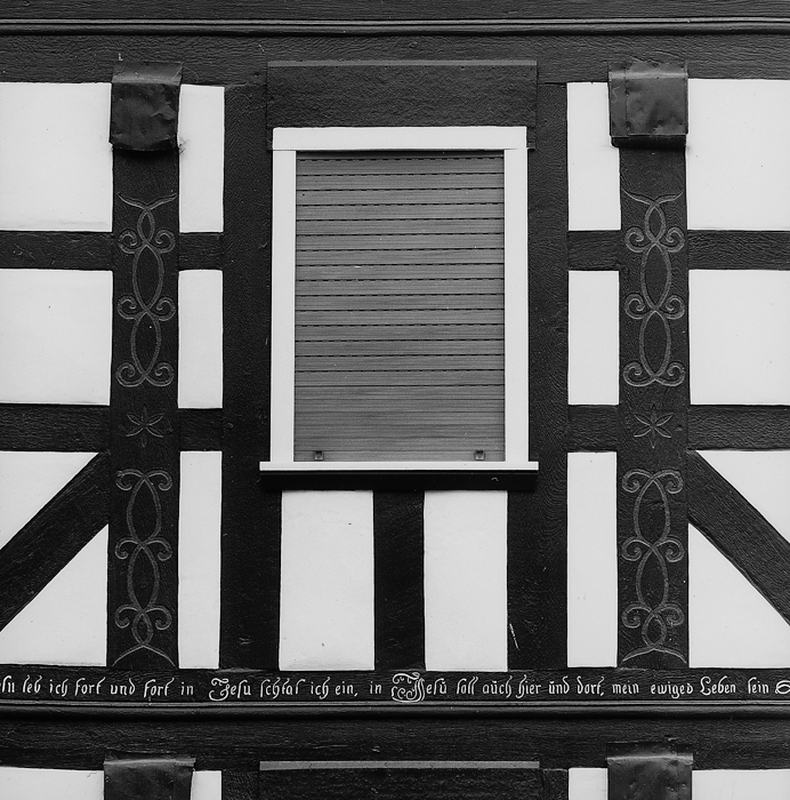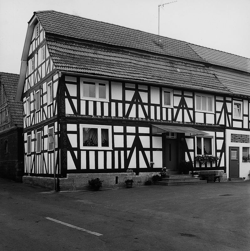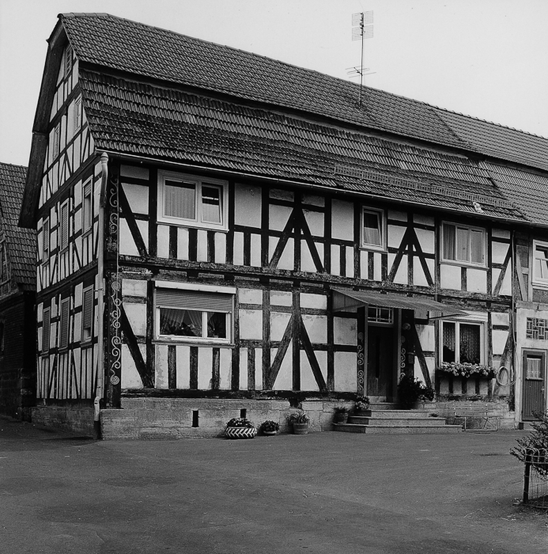 In der Gruppe der stattlichen Hofanlagen in diesem Bereich des Straßenzuges erhebt sich das ins Jahr 1820 datierte Wohnhaus in einer klar gegliederten, dichten Fachwerkkonfiguration: die kräftigen Eck- und Bundständerwerden durch 3/4-Streben mit Brust- und Sturzriegeln verfestigt, dazwischen umläuft ein Leitermotiv den Brüstungsbereich beider Geschosse. An den Eckständern Rankenornamente in Flachschnitzdekor.