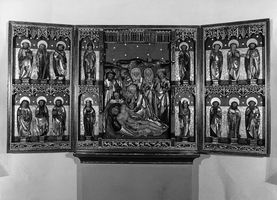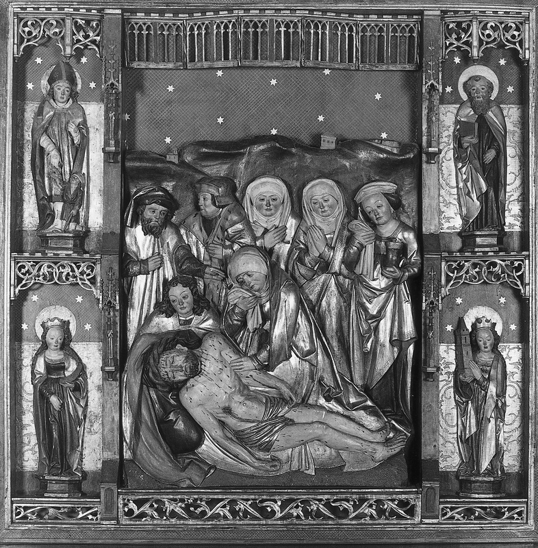Besonders bemerkenswert ist der erhaltene Schnitzaltar, der wohl um 1500 in einer thüringischen Werkstatt entstanden ist. Der Mittelschrein stellt eine achtfigurige Beweinungsszene mit dem dafür kanonischen Figurenensemble dar. Die Szene wird in zwei Registern von den Heiligen Martin und Paulus sowie Katharina und Barbara gerahmt. In den Seitenflügeln flankieren zu Dreiergruppen zusammengefasste Apostelfiguren das Geschehen des Mittelteiles. Das Fragment einer ähnlichen Beweinungsszene befindet sich in der Kirche zu Netra.