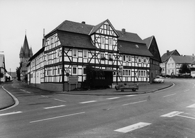 Traufständiger Gasthof an ortsbildprägender Straßenkreuzung in stattlicher Größe mit repräsentativem Fachwerkgefüge aus dem letzten Drittel des 18. Jhs. Die Fachwerkkonfiguration wird besonders durch die an Eck- und Bundständern befindlichen K-Streben betont, die Unterkante der Schwelle wird durch eine geteilte Fase profiliert. An den Füllhölzern Reste von Flachschnitzdekor. Als oberer Abschluss dient ein abgewalmtes Mansarddach mit eingestelltem Zwerchhaus.