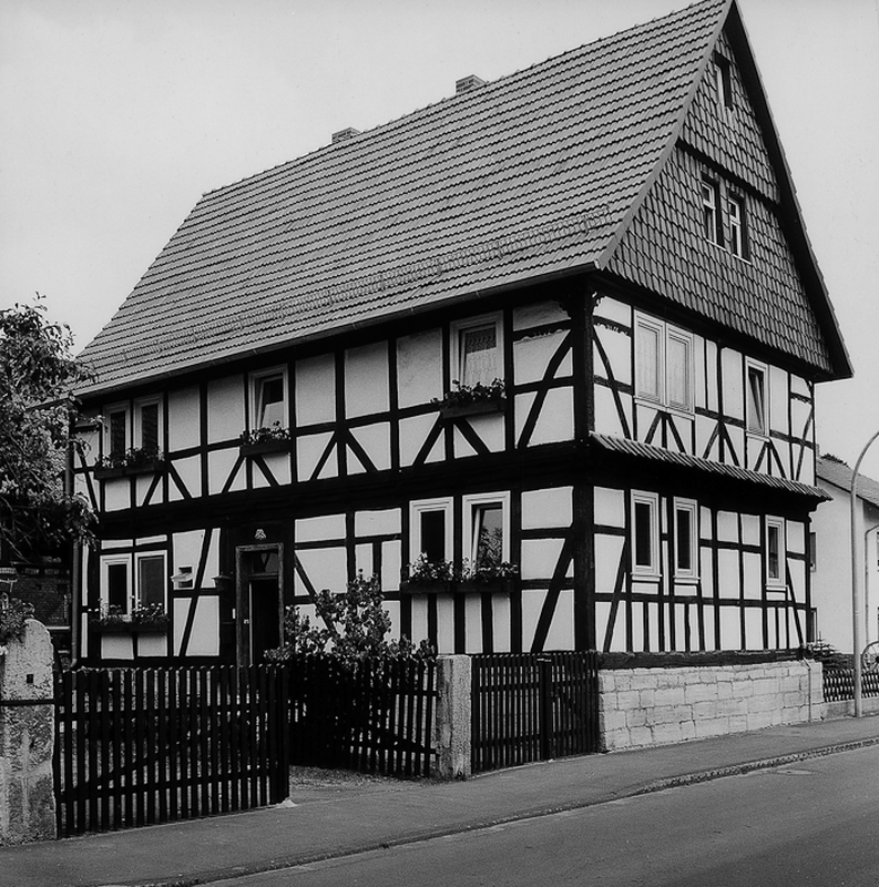 Hofanlage, bestehend aus einem giebelständigen Wohnhaus, einem Wirtschaftsgebäude sowie der erhaltenen Hofeinfassung. Das Wohnhaus trägt eine Datierung in das Jahr 1705, das Fachwerkgefüge entspricht in seinem Gerüstraster aus Mannfiguren an den Eckständern und konvergierenden Fußstreben an den Zwischenständern eher der Sockeldatierung von 1799. Die Scheune befindet sich im Originalzustand des Jahres 1813. Die Konstruktion des Ständerbaues wird durch zwei Riegel und schwertartige Verstrebungen versteift. Die Hofeinfassung besteht aus einer flachen Kalksteinmauer und original erhaltenen Torpfosten.