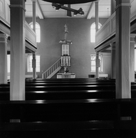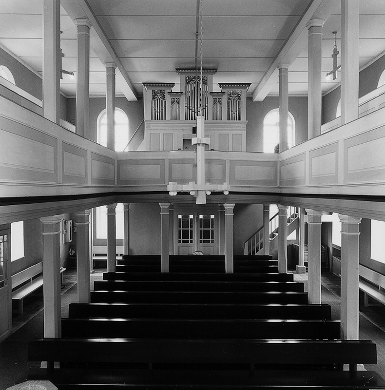 Im Inneren erhebt sich ein typischer Kastenraum klassizistischer Prägung mit umlaufenden Emporen, einer konkav in den Raum ausschwingenden Brüstung der Orgelempore sowie einer erhöht angebrachten Kanzel in der Mittelachse des Saales.