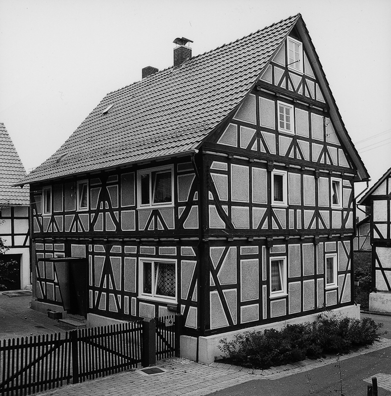 Giebelständiges Wohnhaus in zwei Geschossen über hohem, massivem Sockel mit Mannfiguren an den Eckständem, an der Schwelle geteilte Fase. Besonders markant sind die Fußstreben der Eckständer im Obergeschoss, die mit