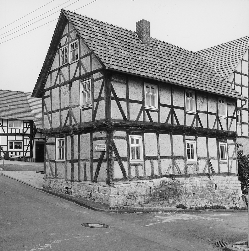 Wohnhaus aus der zweiten Hälfte des 18. Jhs. an markanter Ecklage zur Hintergasse mit klar gegliederter Fachwerkkonfiguration: an den Eckständern 3/4-Streben, dazwischen konvergierende Fußstreben im Brüstungsbereich. Die Unterkante der Schwelle wird durch eine geteilte Fase profiliert.