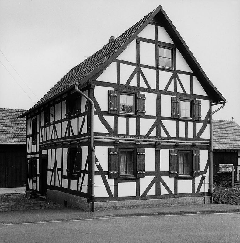 Giebelständiges, um 1780 errichtetes Wohnhaus mit jüngerem Anbau. Besonders charakteristisch sind die an den Eckständern befindlichen „Kuhfußstreben", die auf der Schwelle aufsitzen, deren Unterkante durch eine geteilte Fase profiliert wird.