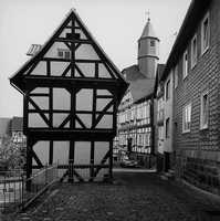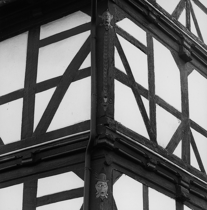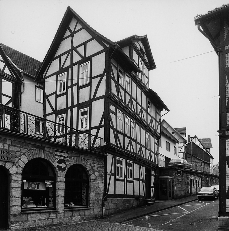 Traufständiges Wohnhaus an der Ecksituation zum Marktplatz aus der Mitte des 17. Jhs. mit repräsentativem Fachwerkgefüge: an den Eckständern Mannfiguren mit geschwungenen Fußstreben, dazwischen konvergierende Fußstreben im Brüstungsbereich. An der Unterkante der Schwelle und an den Füllhölzern eingelegte Schiffskehlen mit Rundstab, an den Eckständern figürlicher Flachschnitzdekor.