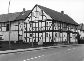 Das traufseitige Wohnhaus, das um 1780 erbaut wurde, erhebt sich an ortsbildprägender Stelle an der Einfahrt in den Burggraben mit einem repräsentativen Fachwerkgefüge, bestehend aus Mannfiguren an den Eckständern sowie einem dazwischen verspannten Leitermotiv im Brüstungsbereich. Das Wirtschaftsgebäude schließt sich unmittelbar an das Wohnhaus an.