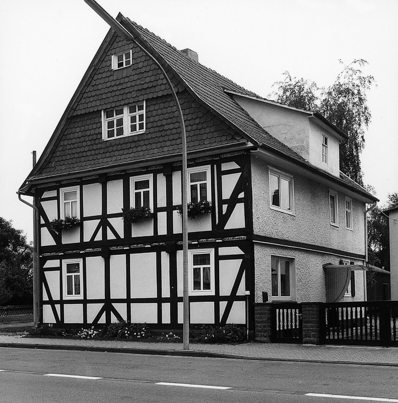 Das an den Traufseiten verputzte Wohnhaus mit den kräftigen Mannfiguren an den Eckständern wurde um 1700 erbaut. Es setzt als ehemals kleinbäuerliches Anwesen einen städtebaulichen Akzent in diesem mit vielen Störungen durchsetzten Bereich des Straßenzuges.