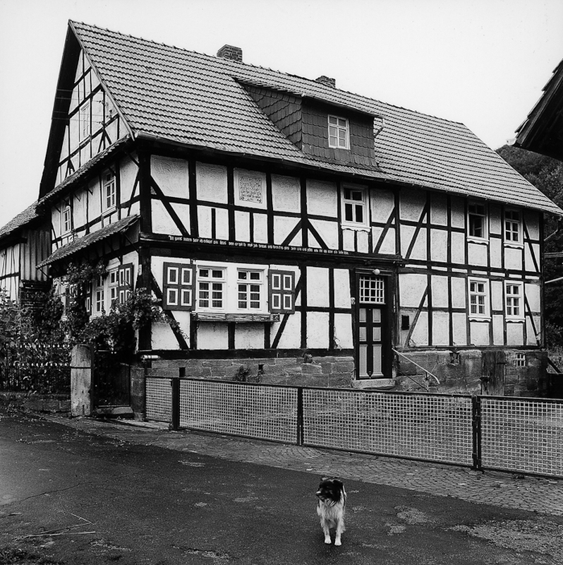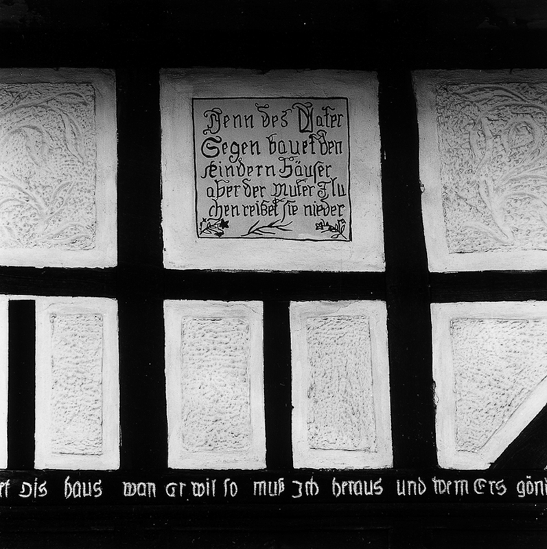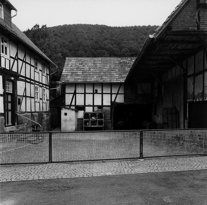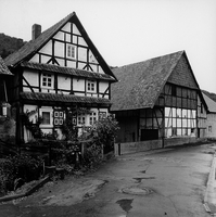 Wirtschaftsgebäude in konstruktivem Fachwerk, zum Teil in Ständerbauweise über einem Sandsteinsockel.