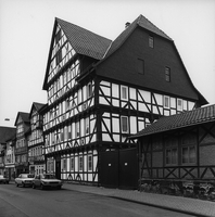 Den Straßenraum beherrschendes Fachwerkwohnhaus repräsentativer Größe mit markanter Fachwerkkonfiguration und hervorgehobenen Schmuckformen im Bereich des kräftig ausgebildeten Geschossüberstandes. Sein stattliches Erscheinungsbild verdankt das Gebäude dem groß eingelagerten Zwerchhaus, dessen Giebel in der Kehl- bzw. Hahnenbalkenlage von zwei Luken geöffnet wird. Die Giebelseiten des hauseindeckenden Krüppelwalmdaches werden ebenfalls zweigeschossig geöffnet. An den Eck- und Bundständern aller Geschosse und im Zwerchhaus des Gebäudes finden sich doppelt verriegelte Mannfiguren mit weit ausladenden Fußstreben, die an der Traufseite mit Dornen besetzt sind. In den Brüstungsgefachen des Untergeschosses geschweifte Fußstreben mit Füßen und Dornen. Im ersten Obergeschoss treten neben ebensolchen Fußstreben Feuerböcke auf. In den Brüstungsgefachen des zweiten Obergeschosses hat sich schließlich die Versteifung der Brüstungsgefache auf die Feuerböcke reduziert. Besonders markant sind die volutenförmigen Knaggen im Bereich des kräftig artikulierten Geschossüberstandes, welche die stark vortretenden Balkenköpfe unterfangen. Oberhalb der Eingangstür befinden sich unterhalb der Balkenköpfe zwei aufgelegte Masken in der Funktion von Wächterfiguren. Die Eckständer der Obergeschosse werden von Säulen bzw. Rundstäben hervorgehoben, die Eckständer des Untergeschosses sind mit Beschlagwerk versehen. Das Gebäude ist kurz nach dem Stadtbrand in die Mitte des 17. Jhs. zu datieren.