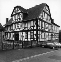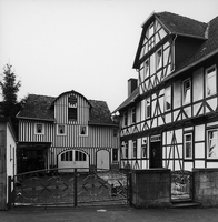 Groß dimensioniertes Fachwerkgebäude über mächtigem Sandsteinsockel, der das abschüssige Terrain auffängt. Rechts giebelständiges Wohnhaus mit Krüppelwalmdach in zwei Geschossen mit markanter Fachwerkkonfiguration aus dem Ende des 18. Jhs., bestehend aus Mannfiguren an den Eck- und Bundständern mit verzierten Fußstreben. Die Fachwerkkonstruktion des Untergeschosses mit doppelt verriegelten Stockwerkstreben ist jünger. Rechtsseitig angeschlossen erhebt sich ein ebenfalls jüngerer, zweigeschossiger Anbau in konstruktivem Fachwerkgerüst aus dem Ende des 19. Jhs. mit doppelt verriegelten Stockwerkstreben an Eck- und Bundständern. Im abschließenden Grundstücksbereich befindet sich eine beachtenswerte Remise.