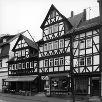 Dreigeschossiges Wohn- und Geschäftshaus aus der ersten Hälfte des 18. Jhs., dessen zweites Obergeschoss von Mannfiguren mit Hals- und Brustriegeln versteift wird; ebensolche Fachwerkkonfiguration im Zwerchhaus. Im ersten Obergeschoss keine ausgebildeten Fachwerkfiguren.
