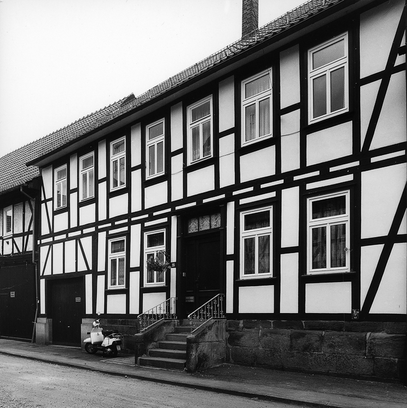 In regelmäßigem Gerüstraster erbautes Wohnhaus über hohem Sandsteinsockel aus der Mitte des 19. Jhs. mit Stockwerkstreben in den Eckgefachen. An der linken Seite spätere Erweiterung mit einer Zufahrt in den Hofbereich. Der Eingang wird von einer einläufigen Sandsteintreppe erschlossen.