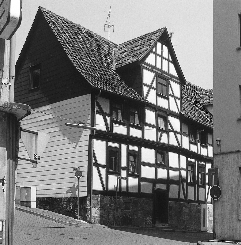 Am Beginn des Weges setzt ein Fachwerkwohnhaus aus der zweiten Hälfte des 16. Jhs. einen deutlichen, Auftakt setzenden Akzent. Das Fachwerkgefüge im Obergeschoss setzt sich aus zum Teil mehrfach verriegelten 3/4-Streben zusammen, die aus starken Hölzern bestehen. Indiz für die frühe Datierung des Hauses sind die mächtigen Schiffskehlen im Bereich des Geschossüberstandes. Das eingestellte Zwerchhaus und Teile des Untergeschosses sind wesentlich jünger. Erhalten ist ein tonnengewölbter Keller.