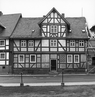 In dichter Zeilenbebauung traufständig orientiertes Fachwerkwohnhaus um 1800 mit einem älteren Kern, kenntlich an den gekehlten Füllhölzern. Die aktuelle Bausubstanz rekrutiert sich aus einem Fachwerkgerüst mit einfach verriegelten, weit ausgreifenden 3/4-Streben im Obergeschoss, im Untergeschoss gegenläufige Fußstreben im Brüstungsbereich. Im Zwerchhaus Mannfiguren mit Hals- und Brustriegeln.