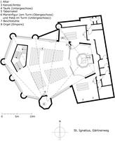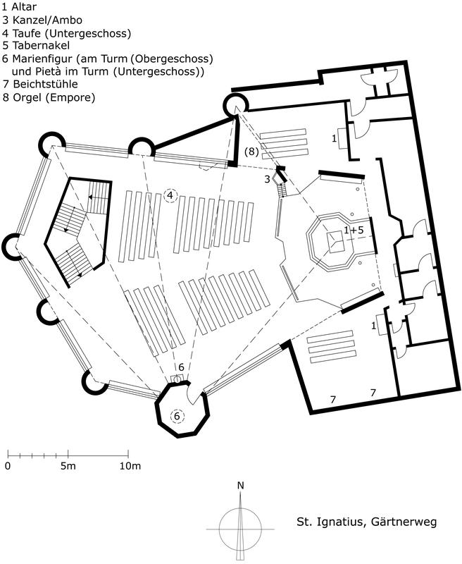 Nördlich der Alten Oper und des Baukomplexes „Die Welle“, östlich des Rothschildparks, erhebt sich St. Ignatius. Zur Straße weisend, über ragt der schlanke Kirchturm die umgebende zumeist viergeschossige Wohnbebauung. Den Straßenzug prägen Materialien wie Putz, Glas, Stahl und Sandstein. Davon hebt sich die kristallin geformte Kirche mit ihren betonsichtigen Wand- und verschieferten Dachflächen ab. Im Erdgeschoss der Kirche öffnet sich zwischen Gemeindehaus und Turm ein Platz. Ihn rahmen Stützen, die Kreuzwegstationen bergen und das Obergeschoss der Kirche tragen. Der durchgehende Bodenbelag führt im Erdgeschoss zur Taufkapelle, die weißtonige Betonglasflächen belichten. Von hier erschließt eine Treppe das Obergeschoss mit dem Kirchenraum.