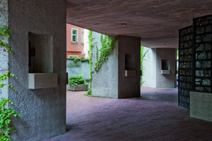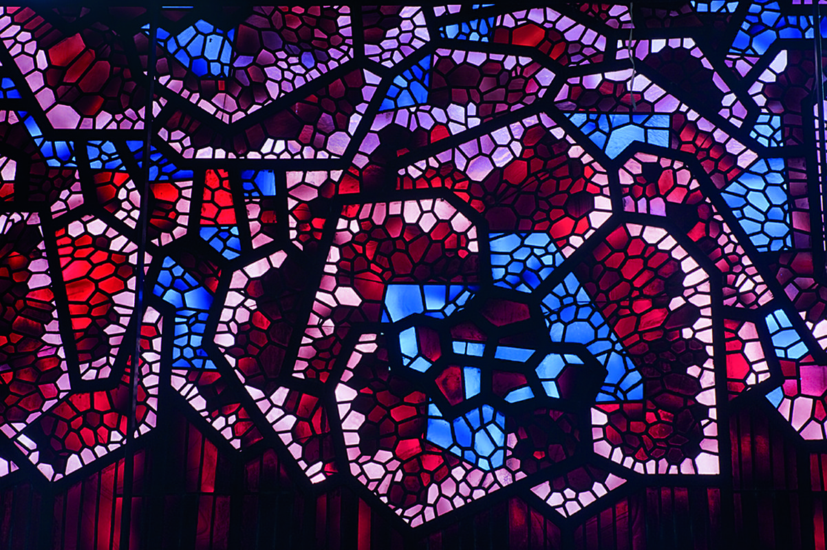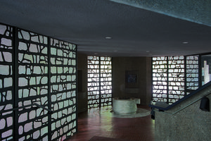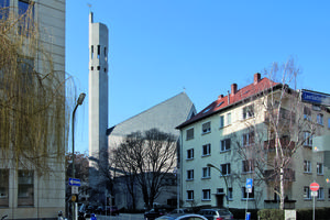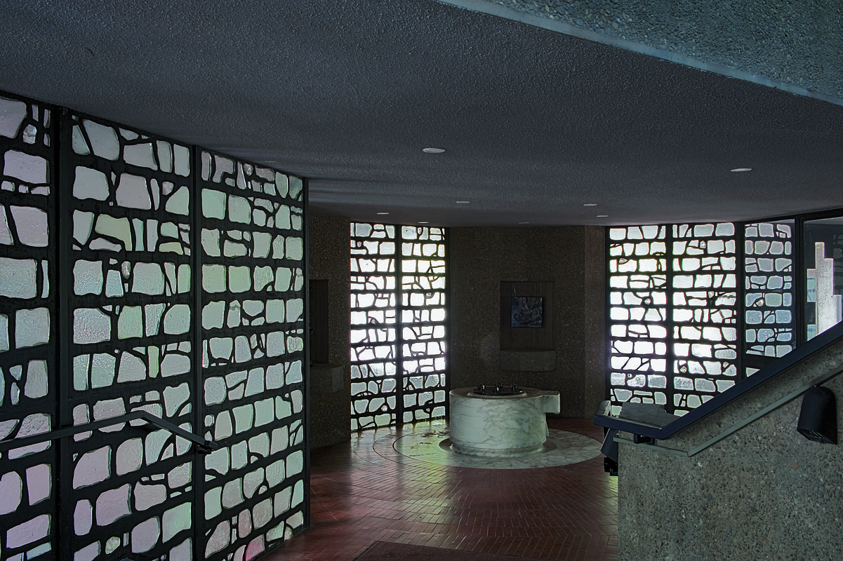 Der Blick fällt zunächst auf die Innenseite des Kirchturms, auf den die Linien der Betonfaltdecke zielen. Als durchbrochene Stele gestaltet, birgt der Turm eine Marienfigur. Fisch grätförmig weisen die Bänke nach Osten zur Altarinsel. Einzelne Gewölbelinien laufen über dem um vier Stufen erhöhten Altarblock zusammen. Ihn betonen zudem ein Kruzifix sowie Bleiglasfenster, deren Rosenmotiv sich vielfach im gesamten Kirchenraum als umlaufendes Fensterband fortsetzt. Nördlich des Altars ist ein kanzelartiger Ambo in die Wand eingebunden.