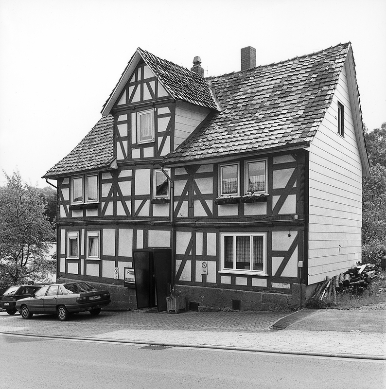 Typisches Fachwerkwohnhaus aus der Mitte des 18. Jhs. am Rand der historischen Ortslage mit einer Fachwerkkonfiguration im Obergeschoss, die sich aus Mannfiguren mit Hals- und Brustriegeln an den Eck- und Bundständern aus starken Hölzern zusammensetzt. Die gleiche Fachwerkkonstruktion findet sich im Zwerchhaus. Die Eckständer werden von dicken Taustäben besonders hervorgehoben.