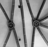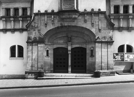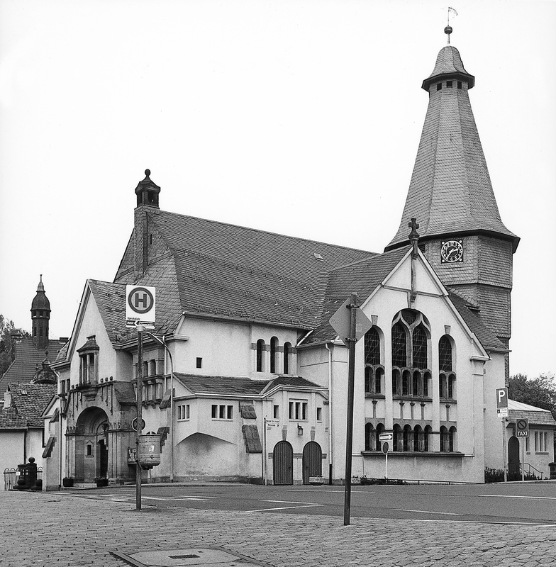 An der Fassadenseite der Kirche ist die Struktur des Innenraumes mit den querhausartigen Anbauten erkennbar. Deutlich hervorgehoben ist die Eingangssituation mit dem doppelten Portal in tiefem Gewände.