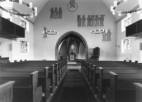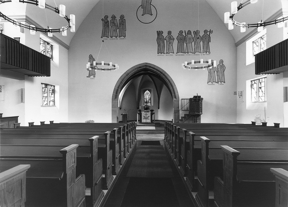 Das Innere der Kirche ist in seiner großzügigen Übersichtlichkeit ein typischer Sakralraum des frühen 20. Jhs. Der annähernd quadratische Raum wird von einer hohen, tonnengewölbten Betonschale überspannt. In diese schneiden kräftige Stichkappen ein, die über den seitlichen Nebenräumen - diese stehen in der Typologie von Querhäusern - aufsteigen. Raumzusammenfassend umläuft eine dreiseitige Empore das Innere. Deutlich abgesetzt von dem modernen Raum ist der spätmittelalterliche Chor im Osten. Durch zwei Stufen erhöht folgt dem Saal in östlicher Richtung ein queroblonges Vorchojoch; darauf schließt der Chor mit einem 5/8-Schluß an. Vorchor und Chor werden von Kreuzrippengewölben abgeschlossen, die über Konsolen aufsteigen.