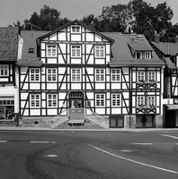Breit gelagertes Fachwerkwohnhaus in imposanter Größe, traufständig in zwei Geschossen über hohem Sockel erschlossen und mit einer zweiläufigen Sandsteintreppe versehen. Das Fachwerkgerüst rekrutiert sich aus einem regelmäßig abgearbeiteten Gerüstraster mit doppelt verriegelten Stockwerkstreben, ebenso im Zwerchhaus. Die Haustür stammt aus der Bauzeit. Rechts angeschlossen ist ein gründerzeitlicher Anbau mit aufwändigem Schmuckfachwerk. Die Tür stammt aus der Bauzeit.