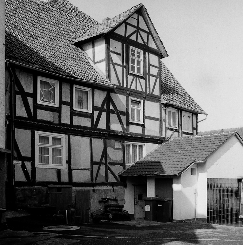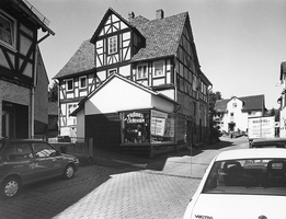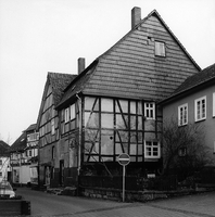 Hoch aufragendes, dreigeschossig erschlossenes Fachwerkgebäude inmitten kleinformatiger Bebauung mit einem historischen Kernbestand, der aus dem 17. Jh. stammt. Dahin verweisen die deutlich gebogenen 3/4-Streben aus starken Hölzern, die einfach verriegelt sind. Die Unterkante der Schwelle wird von dicken Taustäben hervorgehoben, die Eckständer weisen eine Art Schuppenfries auf. Das Gebäude wird trotz massiver baulicher Eingriffe als Kulturdenkmal angesprochen.