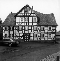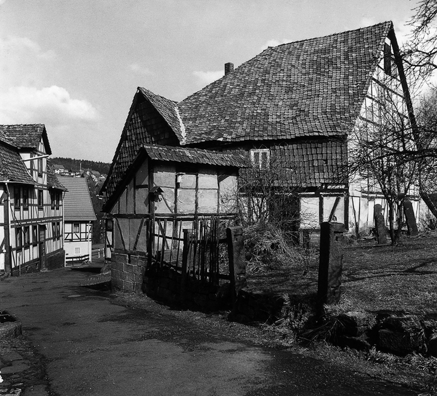 Der obere Rand des Weges wird von einem mächtigen Fachwerkgebäude abgeschlossen, dessen baulicher Kern aus dem frühen 17. Jh. stammt. Das Fachwerkgerüst des Hauses wird von 3/4Streben mit einfacher Verriegelung verfestigt. Das mehrfach veränderte Dach zeugt von einer regen Bautätigkeit im Verlauf der Hausgeschichte. Der linke Teil des Gebäudes ist als deutlich jüngerer Anbau kenntlich. Hinter dem Haus befindet sich ein kleiner Stall.