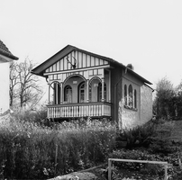 Über einem in das ansteigende Gelände einschneidenden Sockelgeschoß erhebt sich ein eingeschossiger, massiver Baukörper mit flachgeneigtem Satteldach. Auf der Giebelseite Richtung Straße kragt ein Laubengeschoß in Holz vor. Die Rundbogenöffnungen des Kernbaus, die in der Laube korrespondierend fortgeführt werden, lassen eine Entstehungszeit in der 1. Hälfte des 19. Jahrhunderts vermuten. Möglicherweise gibt es eine Beziehung des Gartenhauses zu dem Hofgut auf der gegenüberliegenden Seite der Bahnhofstraße (Nr. 31, vgl. dort). Das kleine Gebäude selbst als Beispiel eines seltenen Bautyps denkmalwert.