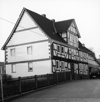 Abseits des Straßenverlaufes erhebt sich ein traufständig erschlossenes Fachwerkwohnhaus mit einem Gerüstraster aus Mannfiguren, Hals- und Brustriegeln im Obergeschoss der mittleren Hauszone, um 1750 zu datieren. Flankiert wird dieser Bauabschnitt auf der linken Seite von einer jüngeren Fachwerkkonstruktion aus einfach verriegelten, nahezu geschosshohen, in die Eckständer eingezapften Streben, die ebenso wie das Zwerchhaus um 1840 erbaut wurde. Der rechtsseitige Anbau mit den einfach verriegelten Stockwerkstreben stammt aus einer Bauphase, die in das letzte Drittel des 19. Jhs. anzusiedeln ist. Markant ist der kräftig ausgebildete Geschossüberstand, dessen Vorsprünge die einzelnen Bauabschnitte verdeutlichen.