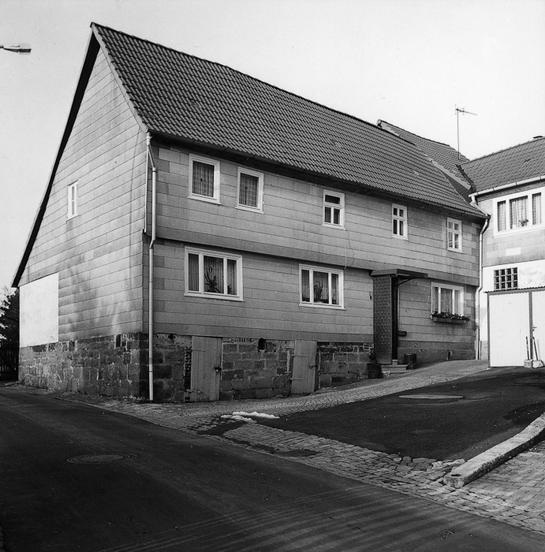 Großformatiges Gebäude oberhalb der Kirche in zwei Geschossen über ausgeprägter Sockelzone und abgeschlepptem Satteldach. Eine Beurteilung der Fachwerkkonstruktion und somit eine genauere Datierung ist nicht möglich, da das Haus mit Eternitplatten versehen ist. Ein Geschossüberstand ist deutlich ausgeprägt. Im vorderen Bereich zwei Kellereingänge. Auf Grund seiner imposanten Größe ist das Haus am Rand der Gesamtanlage aus städtebaulichen Gründen schützenswert.
