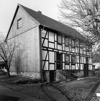 Zweigeschossiges Fachwerkgebäude an einer Freifläche in der Nähe des Dorfgemeinschaftshauses. Linkszonig ist der Wohnbereich, rechts der bescheidene Wirtschaftsteil angesiedelt. Das Haus aus der Mitte des 19. Jhs. verfügt über einen Verband aus einem konstruktiv abgearbeiteten Fachwerkgefüge, das von einfach verriegelten Stockwerkstreben in den Eckgefachen verfestigt wird. Diese bestehen aus dünnen, zum Teil leicht gebogenen Hölzern. Der Eingang wird von einer einläufigen Sandsteintreppe erschlossen.