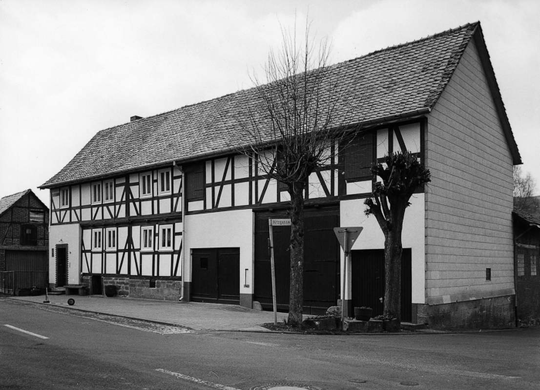 Traufständig orientiertes Einhaus aus dem frühen 19. Jh. mit der zeittypischen Fachwerkkonfiguration im linksseitigen Wohnbereich aus 3/4-Streben, die durch Brust- und Sturzriegel im Fachwerkgerüst verfestigt werden. Im Untergeschoss einfache Verriegelung. Rechts der Stall-Scheune-Trakt mit hoher Toreinfahrt und Ladeluken im Obergeschoss. Trotz einer modernen Störung ist der Bau aus städtebaulichen und geschichtlichen Gründen Kulturdenkmal.