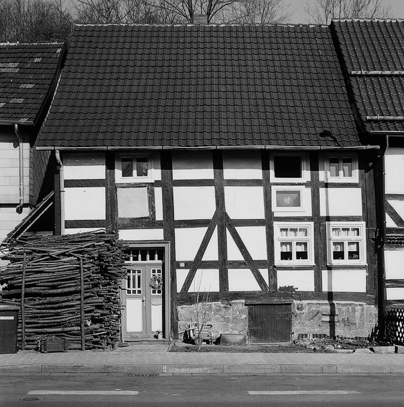 Zu Wohnzwecken umgenutztes Wirtschaftsgebäude in einer schlichten Ständerkonstruktion über hohem Sockel. Das Fachwerkgerüst des Gebäudes wird durch eine Strebe am mittigen, dreifach verriegelten Bundständer verfestigt. Unterhalb der Fensterzone befindet sich ein deutlich erkennbarer Kellereingang. Die Scheune aus der Mitte des 18. Jhs. ist als eines der wenigen erhaltenen Wirtschaftsgebäude im Ort aus dieser Zeit schützenswert.