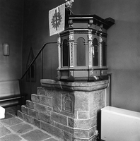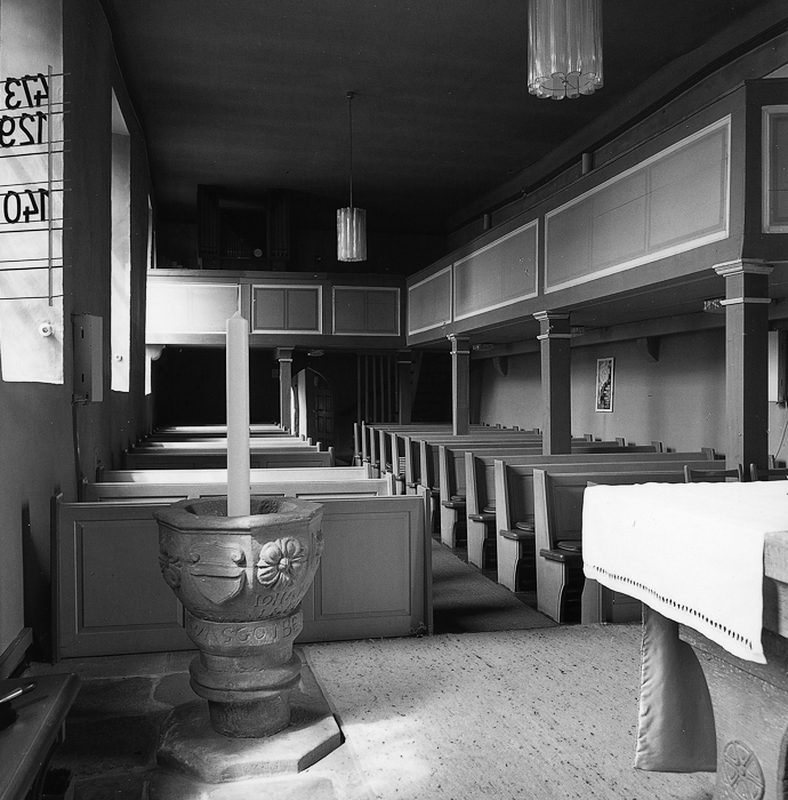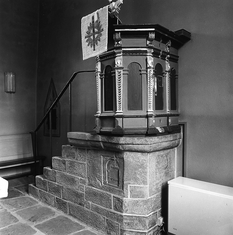 Der Taufstein, ein achtseitiges Becken in der Form eines Kapitells über einfachem Pfeiler, stammt aus dem Jahr 1581, der in der Mittelachse des Raumes angebrachte Kanzelkorb aus der zweiten Hälfte des 17. Jhs. Der Sockel datiert aus dem Jahr 1833.