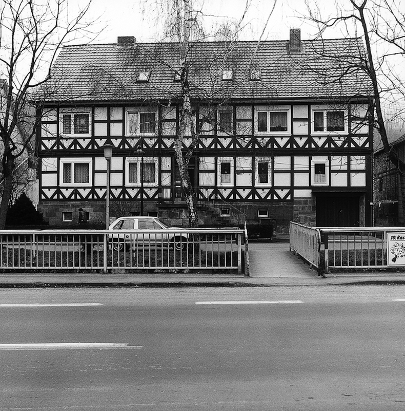 Im Jahr 1910 wurde an dieser städtebaulich markant einsichtigen Stelle ein großes, traufständig erschlossenes Fachwerkgebäude erbaut. Sein Gerüstgefüge ohne ausgebildete Fachwerkfiguren weist in die niedersächsische Baulandschaft. Typisch dafür ist die friesartige Aneinanderreihung konvergierender Fußstreben im Brüstungsbereich beider Geschosse. Jedes Gefach wird durch einen Hängezapfen zusätzlich hervorgehoben.