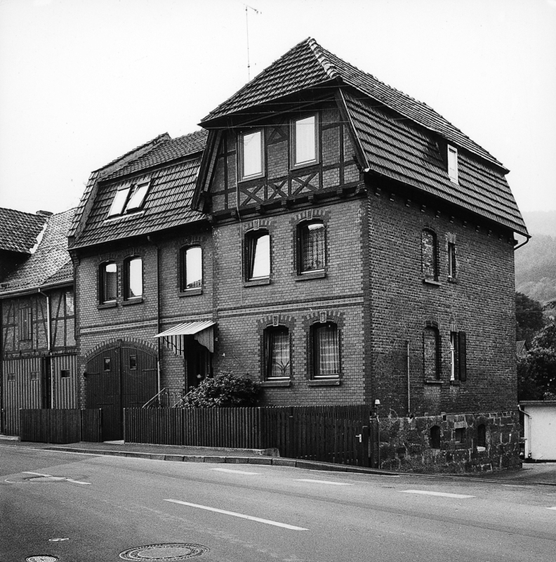 Als Schmuckformen dienen rotbrandiges Mauerwerk und Fachwerkblenden im Giebelbereich. Oberer Abschluss Mansarddach.