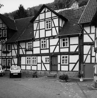 Breit gelagertes, die Platzgestalt bestimmendes Fachwerkwohnhaus über einem hohen Sockel in zwei Geschossen mit einem Fachwerkverband aus der Mitte des 17. Jhs. Eine derart frühe Datierung rechtfertigen vor allem die Schmuckformen im Bereich des Geschossüberstandes: dort Schiffskehlen mit eingelegtem Rundstab. Rechtsseitig angeschlossen ist eine Erweiterung aus dem 19. Jh., Zwerchhaus ebenfalls jünger.