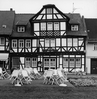 Traufständiges, zweigeschossiges Gasthaus in symmetrischer Fachwerkkonfiguration, die an den Eckständern durch doppelt verriegelte 3/4-Streben verfestigt wird. Den Brüstungsbereich des Zwerchhauses zieren Andreaskreuze mit gebogenen Rauten. Bemerkenswert ist die nach rechts aufsteigende Schwelle des Hauses, das vermutlich in der ersten Hälfte des 18. Jhs. erbaut wurde. Linksseitiger Anbau und Zwerchhaus sind jüngere Zutaten.