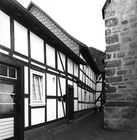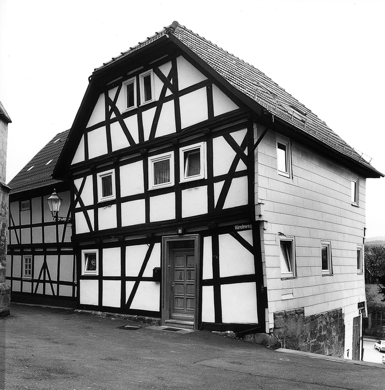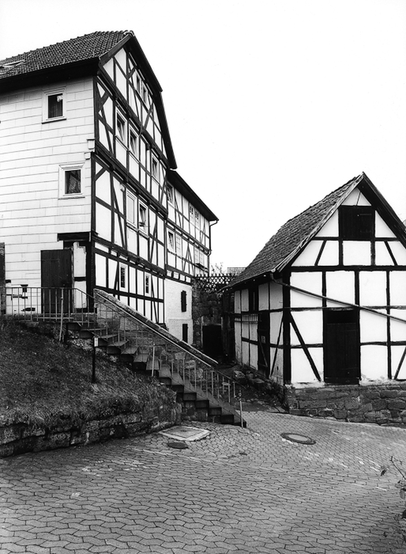 Unterhalb der Kirche erhebt sich über abschüssigem Terrain ein mehrgeschossiges Fachwerkgebäude - das ehemalige Pfarrhaus -, dessen Kern in das Ende des 16. Jhs. datiert. Die Fachwerkkonstruktion des Gebäudes Nr. 8 ist an den Giebelseiten einsehbar: dort prägen Mannfiguren mit überblatteten Kopf- und Fußstreben das Fachwerkgerüst. Im zweiten Obergeschoss wird das Fachwerkgefüge von 3/4-Streben verfestigt, im abgewalmten Giebeldreieck wieder Mannfiguren mit überblatteten Kopf- und Fußstreben. Haus Nr. 7 zeigt eine Fachwerkkonstruktion aus dem 17. Jh. in schlichtem Gerüstraster, daran anschließend folgt ein Wirtschaftsgebäude. Da die Gebäudegruppe eines der ältesten erhaltenen Fachwerkgebäude im ursprünglichen Siedlungskern birgt, ist sie aus städtebaulichen und stadtgeschichtlichen Aspekten schützenswert.