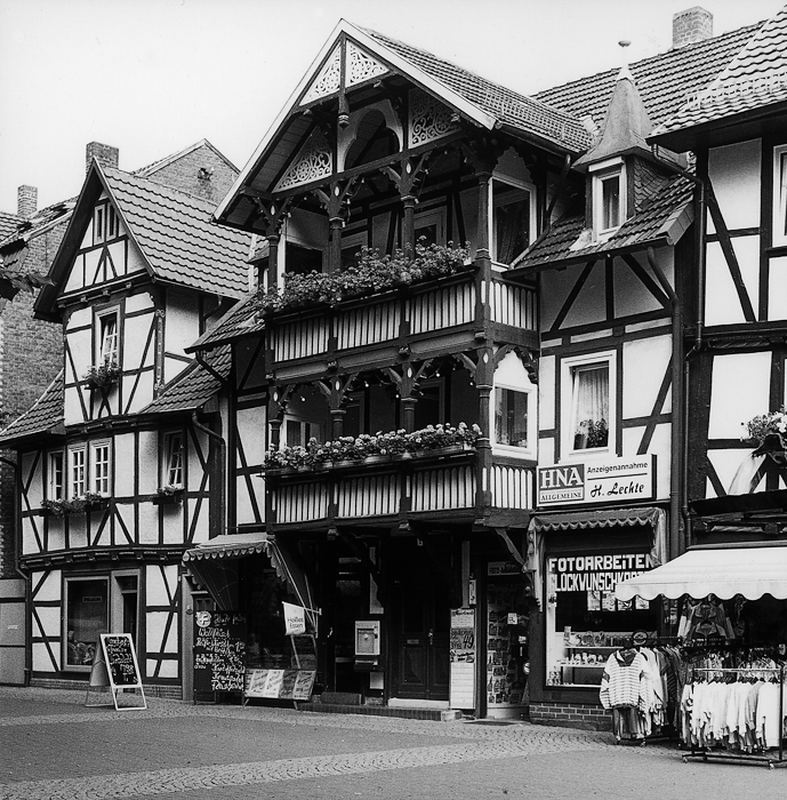 Zweigeschossiges Fachwerkgebäude mit aufgesetztem Kniestock und Zwerchhaus in einer Fachwerkkonstruktion aus dem 19. Jh.; Kern des Hauses sicher älter. Besonders bemerkenswert ist der der Fassade vorgeblendete Balkonvorsatz, der über kräftigen Knaggen aufsitzt. Im Giebelfeld markante Schnitzereien.
