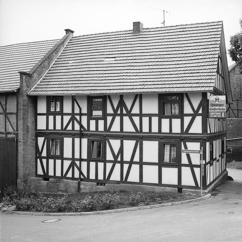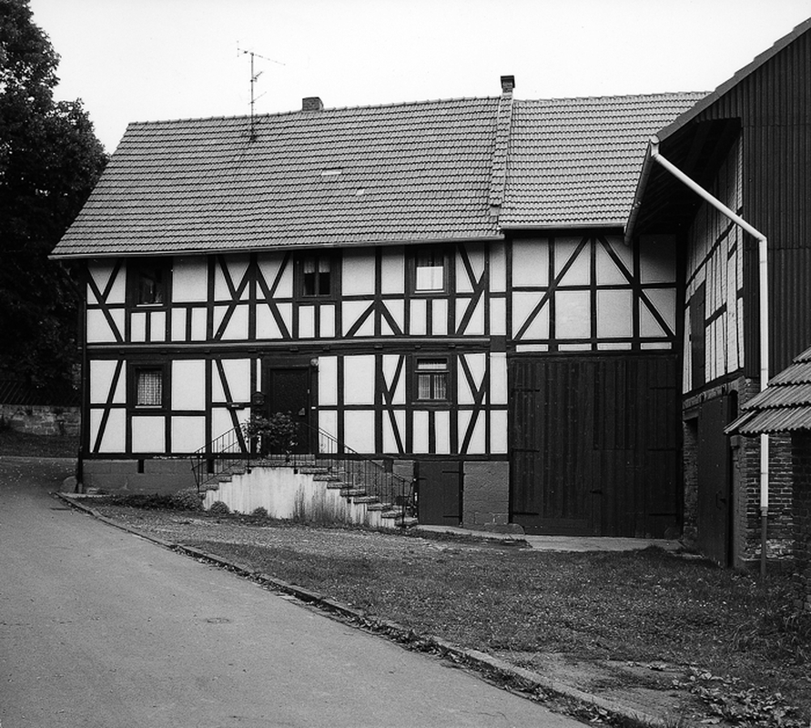 Giebelständig erschlossenes Fachwerkwohnhaus über hohem Sandsteinsockel aus dem Beginn des 19. Jhs., kenntlich an den K-Streben der Eck- und Bundständer im Obergeschoss, deren Hölzer geradlinig verlaufen. Zusätzlich eingelegte Stiele im Brüstungsbereich verdichten das Fachwerkgerüst zu einem gedrängten, regelmäßig strukturierten Gefüge. Angeschlossen sind rechtwinklig abknickende Wirtschaftsgebäude.