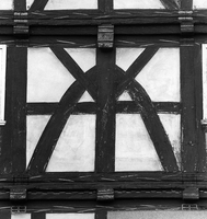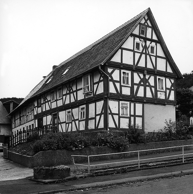 Das giebelständige Fachwerkwohnhaus dieser Hofanlage zählt zur ältesten erhaltenen historischen Bausubstanz des Ortes. Eine Datierungshilfe bietet die erhaltene Fachwerkkonfiguration im Obergeschoss. Dort werden die Eck- und Bundständer von Mannfiguren mit überblatteten Kopf- und Fußstreben versteift. Die Hölzer der Verstrebung sind im oberen Bereich, dort wo sich die Streben kreuzen und mit einem Nagel verbunden werden, leicht gerundet. Ein anderes Indiz für die frühe Datierung des Gebäudes sind die Zickzackbänder im Bereich des Geschossüberstandes. Die Verstrebung des Untergeschosses stammt aus der Mitte des 19. Jhs.