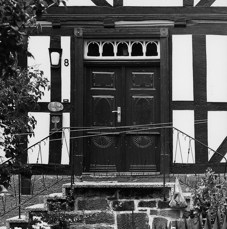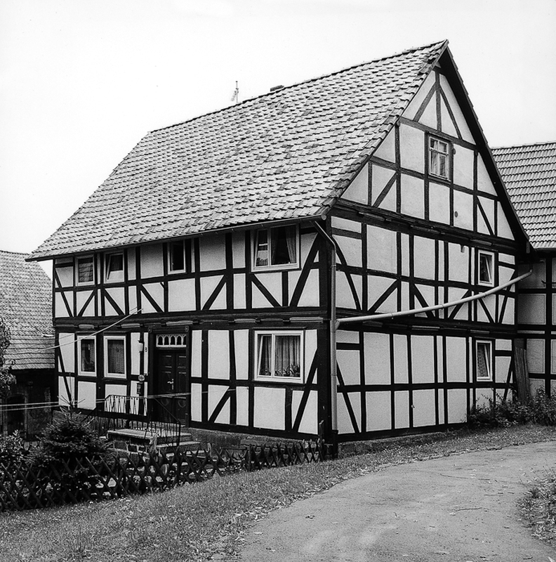 Zweigeschossiges Fachwerkwohnhaus aus dem Ende des 18. Jhs. über hohem Sockel mit einem Gerüstraster, das sich aus leicht geschwungenen 3/4-Streben mit einfacher Verriegelung rekrutiert. Im Obergeschoss wird den Bundständern ein Begleiter zur Seite gestellt, der durch eine Fußstrebe im Brüstungsbereich zusätzlich gesichert wird. Diese statisch nicht notwendige Zutat verdeutlicht das repräsentative Bedürfnis des Bauherren, der sein Haus mit einer Schaufassade versah. Erhalten ist eine Tür mit Oberlicht aus dem späten 19. Jh.