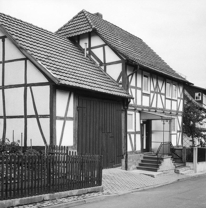 Traufständig erschlossenes Fachwerkwohnhaus mit angeschlossener Scheune. Das zweigeschossige Fachwerkgefüge über hoher Sockelzone ist klar gegliedert: an den Eck- und Bundständern finden sich K-Streben, die eine Datierung in das frühe 19. Jh. erlauben. Abgeschlossen wird das Haus von einem Krüppelwalmdach. Scheune in einfacher Fachwerkkonstruktion mit hoher Einfahrt.