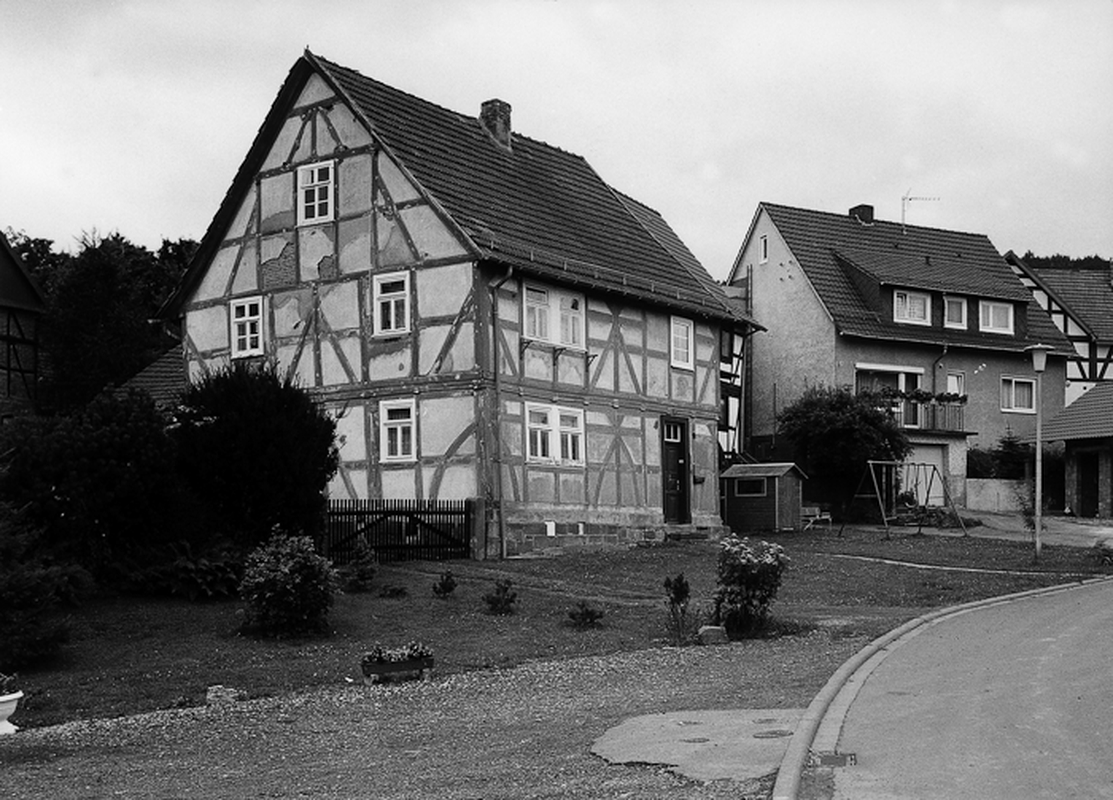 Traufständig erschlossenes Wohnhaus mit ortsunüblichem Fachwerkgerüst, das an der Fassadenseite aus Mannfiguren mit Hals- und Brustriegeln an Eck- und Bundständern in beiden Stockwerken besteht. Ungewöhnlich sind die stark geschnittenen Hölzer, die zum Teil kräftig gebogenen Fußstreben sowie die dicht aufeinander folgenden Riegel. An der Giebelseite einfach verriegelte 3/4-Streben. Das Haus mit einer erhaltenen Biedermeierhaustür stammt aus dem ersten Drittel des 18. Jhs.