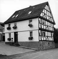 Giebelständiges Wohnhaus in zwei Geschossen über hohem Sandsteinsockel mit einer Fachwerkkonstruktion an der Giebelseite, die von K-Streben an den Eckständern verfestigt wird. Diese Fachwerkfigur setzt sich aus gebogenen 3/4-Streben und angeschlossenen Kopfbändern zusammen. Der Geschossüberstand ist deutlich ausgebildet. Eine Datierung in die erste Hälfte des 18. Jhs. ist daher wahrscheinlich.