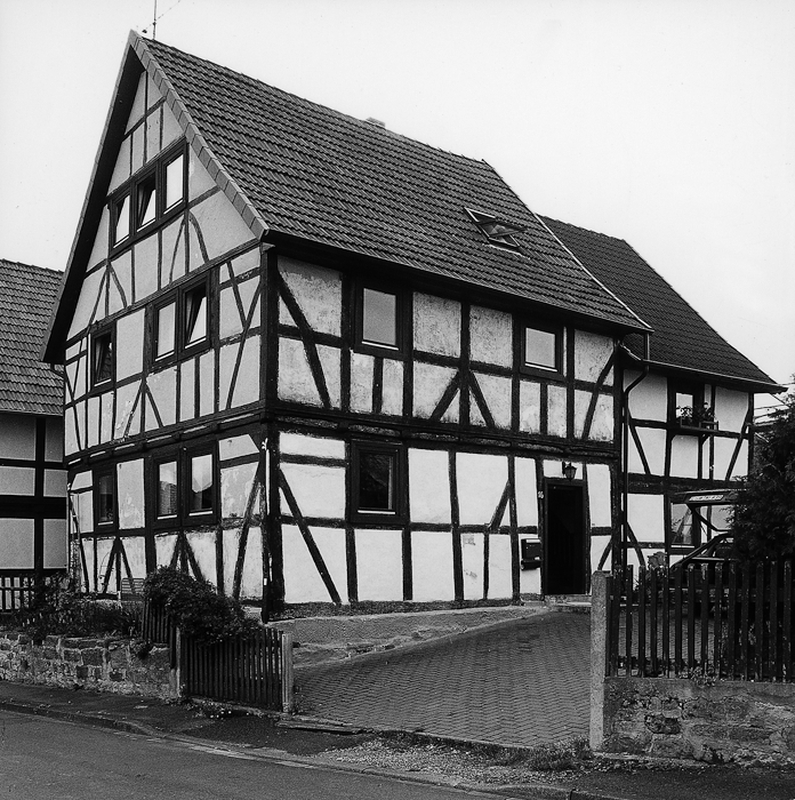 Wohnhaus in zwei Geschossen über hohem Sandsteinsockel mit einer giebelseitigen Schaufassade aus K-Streben im Obergeschoss, im Untergeschoss Mannfiguren mit Hals- und Brustriegeln. Eine Datierung dieser Wand ist um 1800 wahrscheinlich. Die Traufseite mit ihren stark gebogenen 3/4-Streben mit einfachem Riegel an den Eckständern stammt aus einer früheren Bauphase.