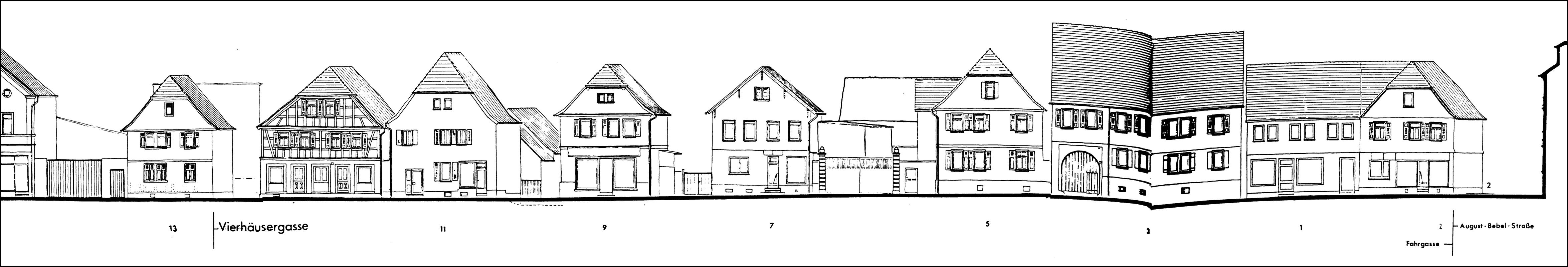 Das Straßenbild wird bestimmt von giebelständigen Fachwerkbauten mit Krüppelwalm als geschlossene Reihe ohne regelmäßige Abstände für Hofeinfahrten (im Gegensatz zur Obergasse); Erdgeschosszonen teilweise massiv erneuert. Die Entstehungszeiten liegen im späten 18. Jahrhundert oder um 1800.