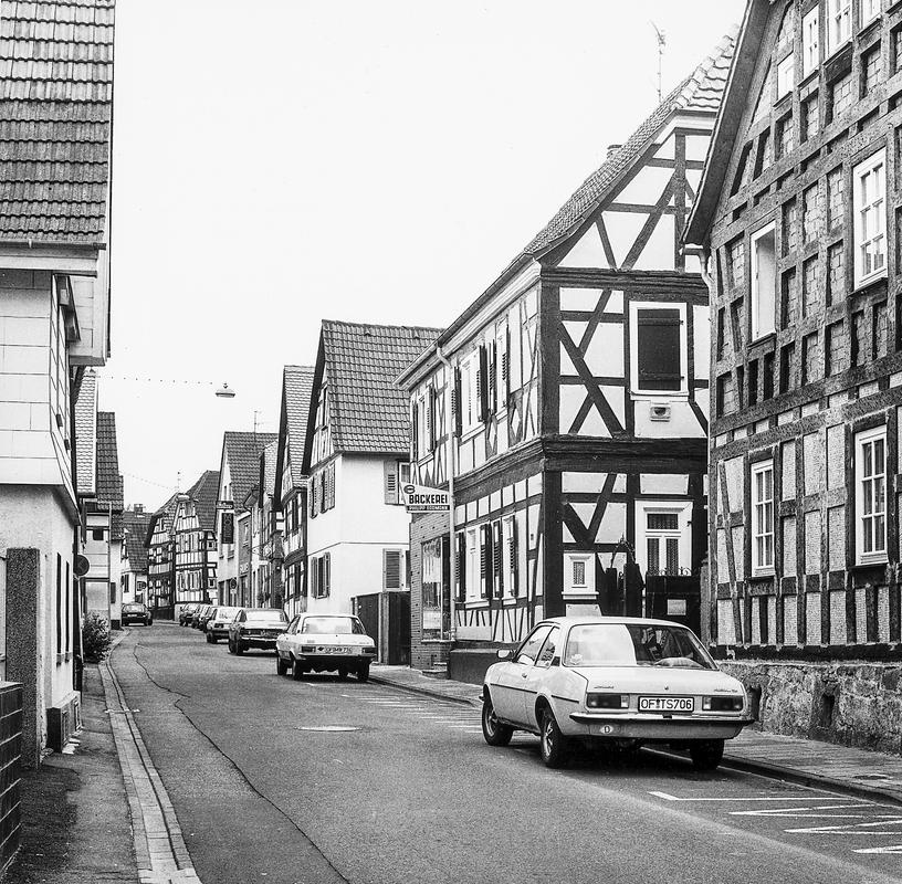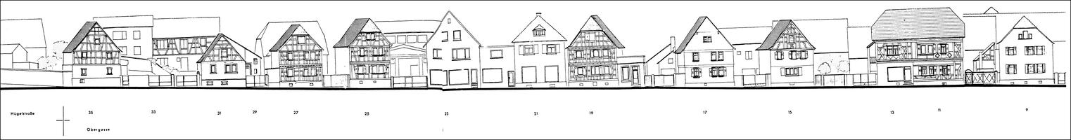 In der Obergasse sind - wie auch in der Fahrgasse - Höfe eines stattlicheren Typs angesiedelt, in der Regel Hakenhöfe mit zum Teil erhaltenen Scheunen und giebelständigen Fachwerkwohnhäusern. Eine ältere Gruppe mit Zierfachwerk (Nr. 15, 16, 17) ist der Entstehungszeit um 1700 zuzuordnen, eine jüngere Hausform des konstruktiven Typs mit Krüppelwalm und geradem, gitterartigem Fachwerk (Nr. 9, 19, 32) wurde um 1800 erbaut. Eine Ausnahme bildet das traufständige Doppelhaus 11/13. Bemerkenswert der Ladenanbau von Nr. 19 als Beispiel für den Einzug städtischer Bauformen in den dörflichen Bereich zu Beginn des 20. Jhs. Ein einfacher Brunnen mit gemauerter Brüstung an der Einmündung Hügelgasse in jüngster Zeit wiedererrichtet.