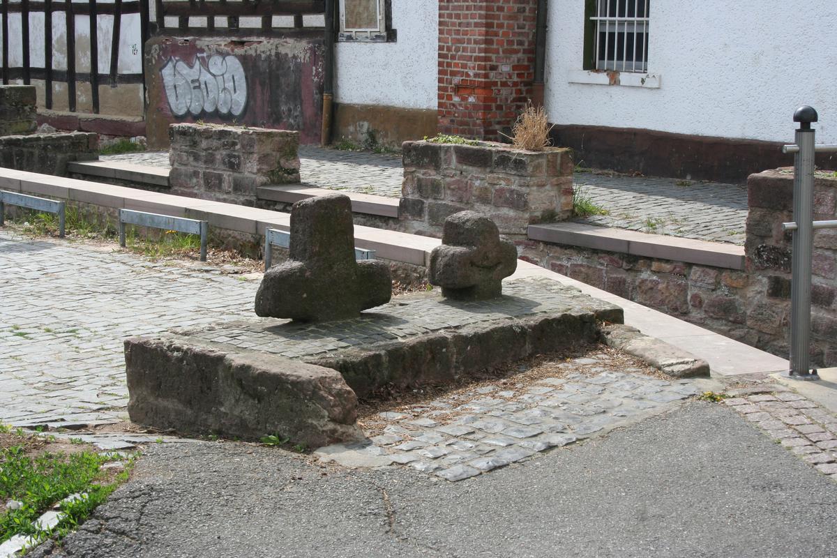 Zwei Steinkreuze aus Rotliegendem, fast bis zu den Kreuzarmen eingemauert. Eines kleiner und stark angewittert, mit Resten einer eingerillten Darstellung. Sühnekreuze des 13.-16. Jhs., seltene mittelalterliche Rechtsdenkmäler. Die Bachgasse, eine alte Straßenführung, ist wahrscheinlich der ursprüngliche Standort. Ein früherer Steinblock zwischen den Kreuzen nicht mehr vorhanden. Kulturdenkmale aus wissenschaftlichen und ortsgeschichtlichen Gründen.